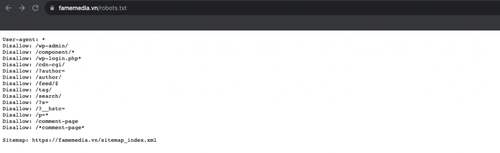 Tệp robots.txt có cấu trúc là https://famemedia.vn/robots.txt và hoàn toàn công khai. Tuy nhiên, bạn không nên sử dụng robots.txt để ẩn nội dung khỏi các công cụ tìm kiếm. Ngoài ra, các crawler hoặc robot malware không thể vi phạm robots.txt.