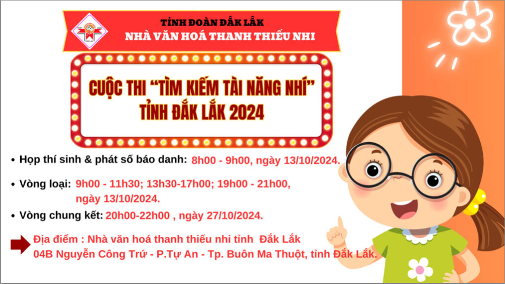 Cuộc thi Tìm kiếm Tài năng Nhí Tỉnh Đắk Lắk 2025 là một sự kiện xúc tiến doanh nghiệp gồm chuỗi các sự kiện dành cho các em thiếu nhi từ 6 đến 14 tuổi. Được tổ chức nhằm tìm kiếm và tôn vinh những tài năng trẻ trong các lĩnh vực nghệ thuật như hát, múa, khiêu vũ, hip-hop, zumba, guitar, võ thuật và ảo thuật…
