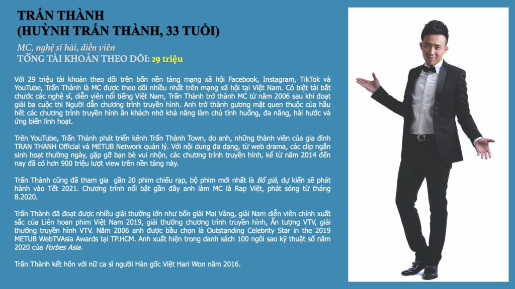 Theo đó, Forbes dựa vào số liệu ban đầu từ SocialBlade để có danh sách sơ bộ, sau đó tìm kiếm tài khoản mạng xã hội phổ biến nhất tại Việt Nam (Facebook, YouTube, Instagram và TikTok) của các nghệ sĩ nổi tiếng ở Việt Nam, tính toán các số liệu về tài khoản theo dõi, mức độ tương tác của người hâm mộ và nghệ sĩ.