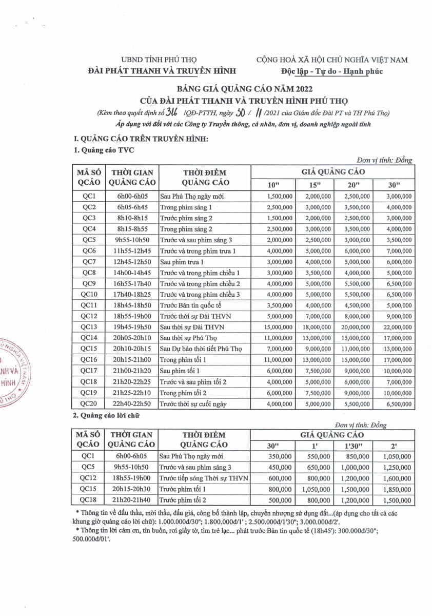 Quảng cáo truyền hình Phú Thọ với bảng giá chi tiết thời lượng, khung giờ, chương trình phát sóng là thông tin hữu ích khi quý doanh nghiệp cần book quảng cáo trên đài truyền hình Phú Thọ.